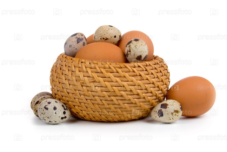 Яйца в корзинке на белом фоне