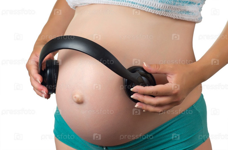 Беременная женщина прикладывает наушники к животу