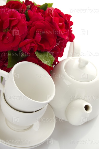 Белый чайный сервиз и букет красных роз