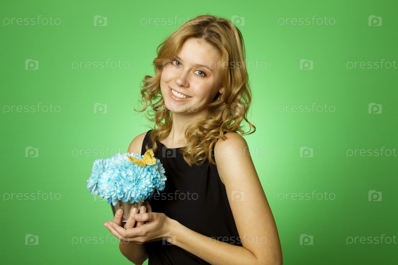 Привлекательная молодая женщина держит букет синих хризантем на зеленом фоне