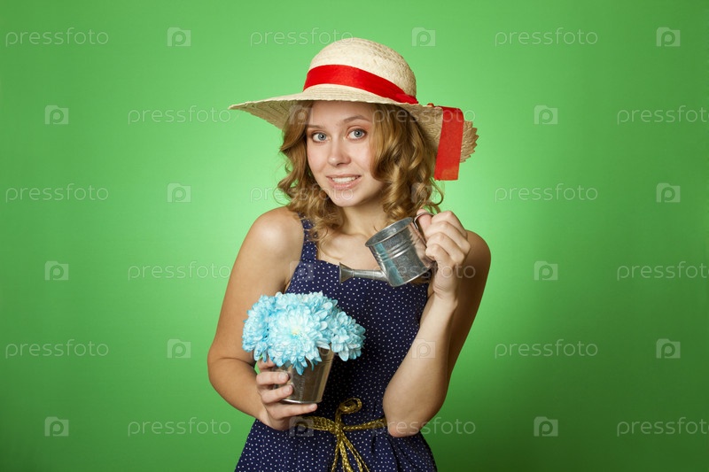 Молодая женщина в шляпе поливает букет синих хризантем из железной лейки на зеленом фоне