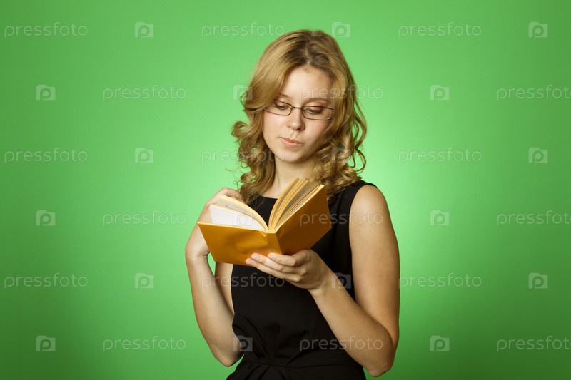 Молодая женщина в очках с книгой на зеленом фоне