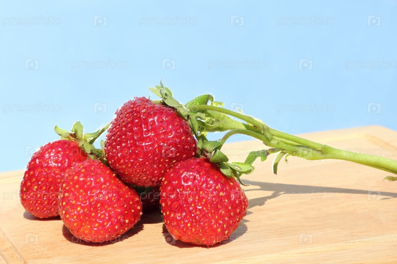 Веточка клубники на разделочной доске на голубом фоне
