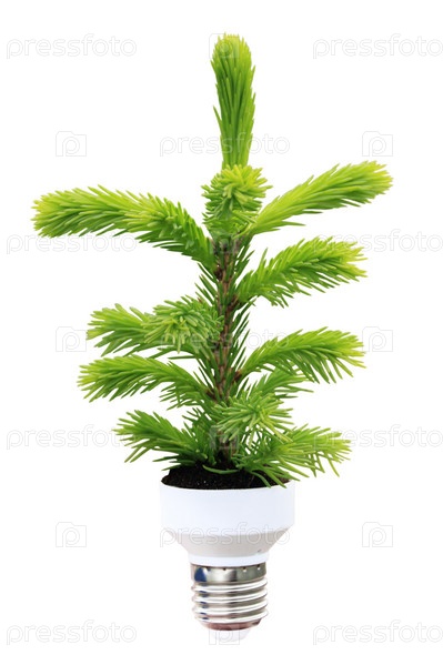 Веточка ели, растущая в цоколе лампочки на белом фоне