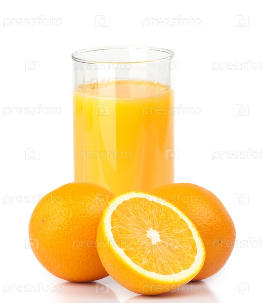 Апельсиновый сок и апельсины на белом