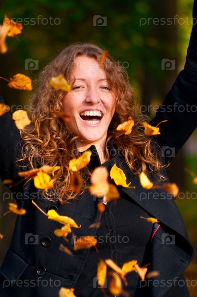 Счастливая женщина бросает осенние листья в парке