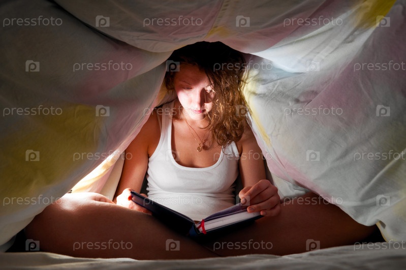 Женщина с книгой в постели под одеялом
