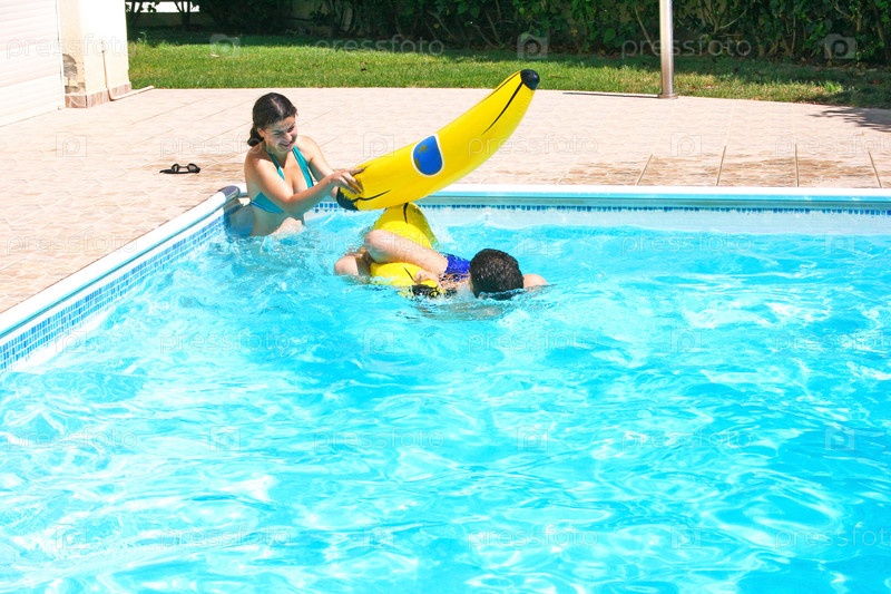 Парень и девушка, играющие с надувными бананами в бассейне