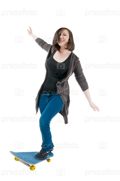 Девушка на скейтборде на белом фоне