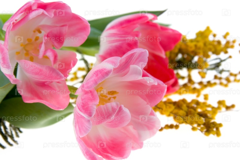 Цветущая мимоза и розовые тюльпаны на белом фоне