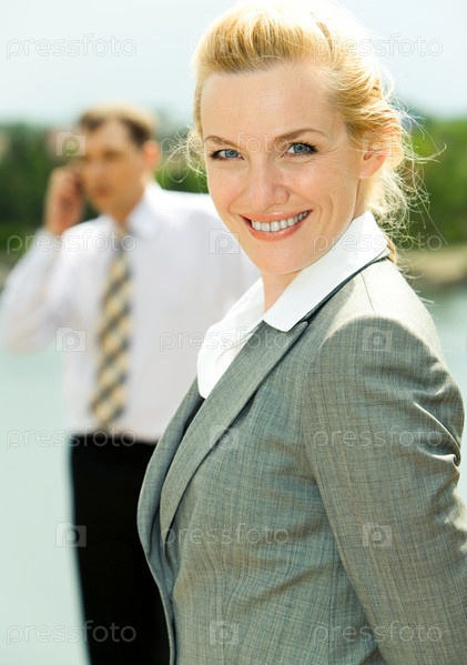 Портрет счастливой бизнес-жены, глядящей в камеру на фоне мужчины