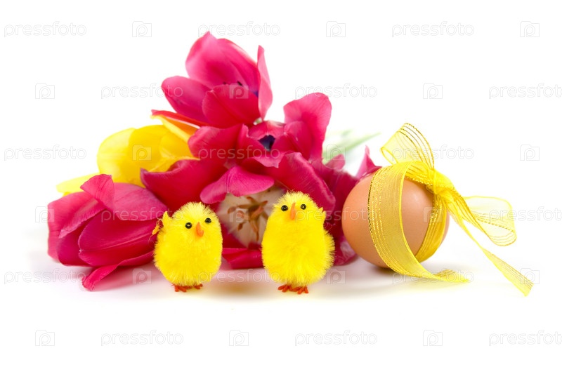 Пасхальное яйцо, цыплята и тюльпаны на белом фоне