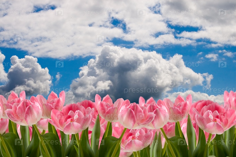 Красивые розовые тюльпаны и облачное небо