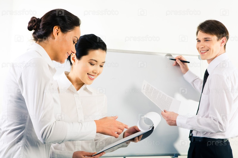 Две успешные бизнес-леди смотрят на блокнот на фоне улыбающегося мужчины, стоящего у доски с бумагой в руке