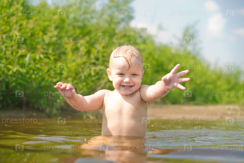 Маленькая девочка купается в реке