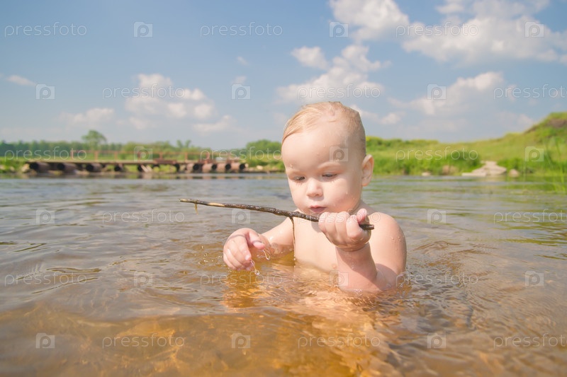 Маленькая девочка купается в реке
