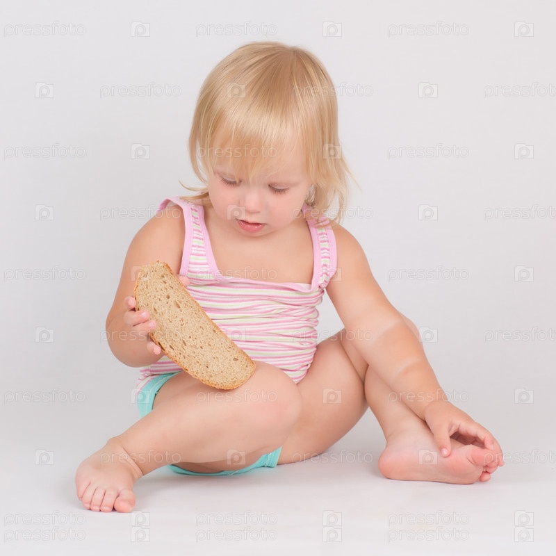Маленькая девочка с куском ржаного хлеба на белом фоне