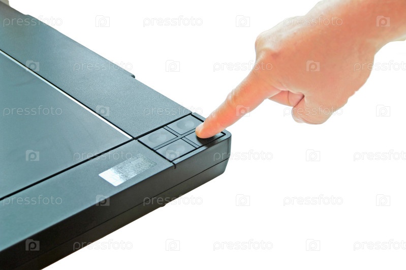 Рука нажимает на кнопку сканера на белом фоне