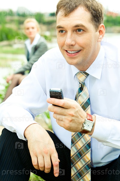 Портрет уверенного бизнесмена, держащего мобильный телефон в руке на фоне сидящей женщины