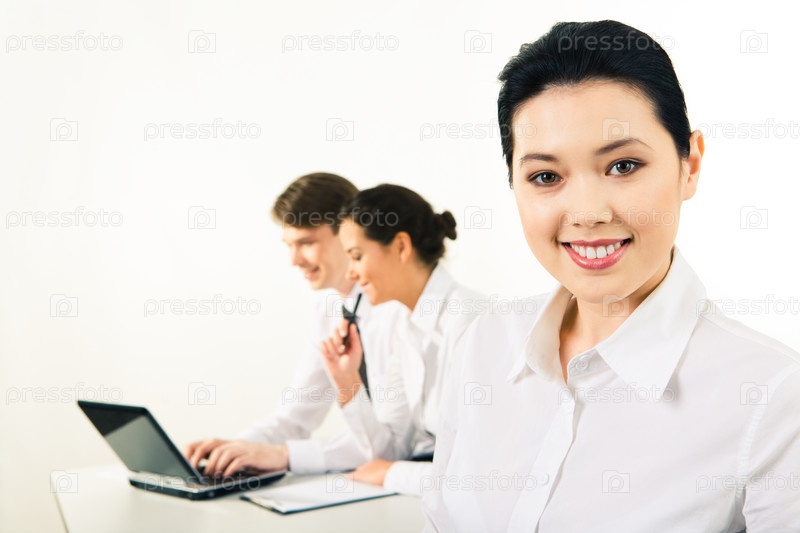 Лицо красивой женщины, смотрящей в камеру с улыбкой на фоне рабочих партнеров