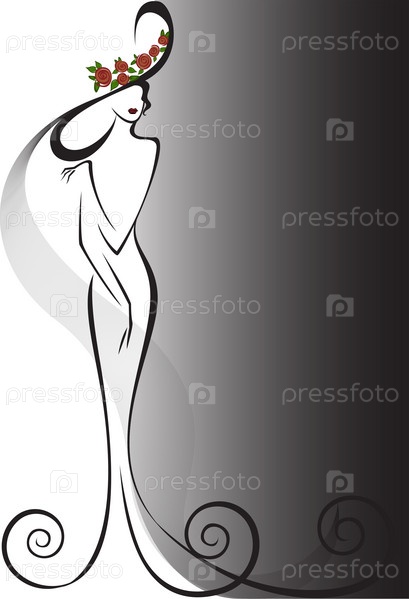 Силуэт стройной женщины в длинном платье и шляпе с красными розами
