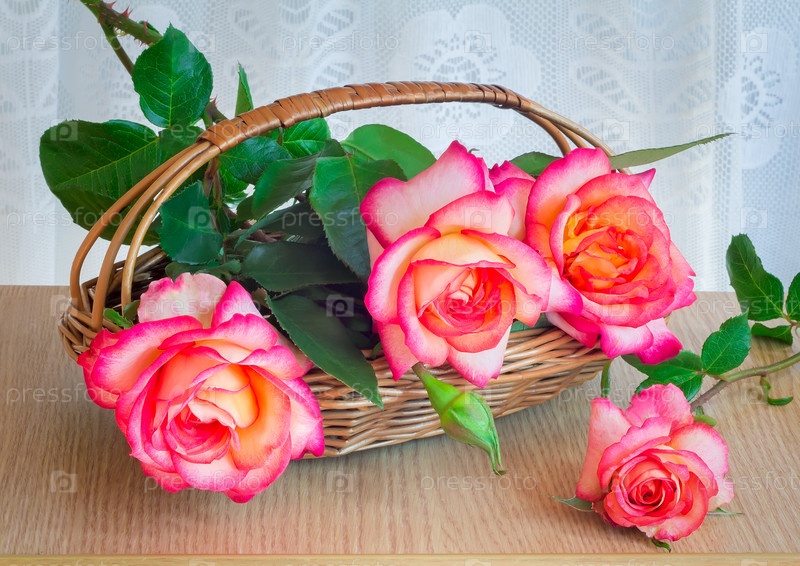 Красивые большие розы с листьями в плетеной корзине на столе