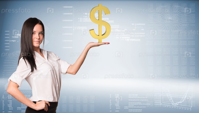 Красивая деловая женщина держит знак доллара