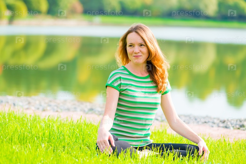 Девушка занимается йогой на берегу озера