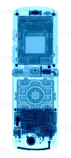 Мобильный телефон в рентгеновских лучах на белом фоне