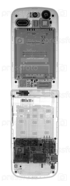 Мобильный телефон в рентгеновских лучах на белом фоне