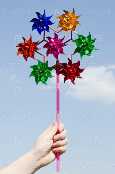 Детская рука держит игрушечную ветряную мельницу на фоне неба