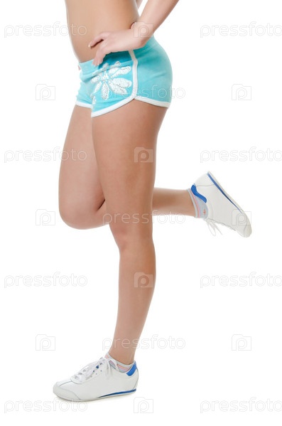 Женское тело в шортах и кедах на белом фоне