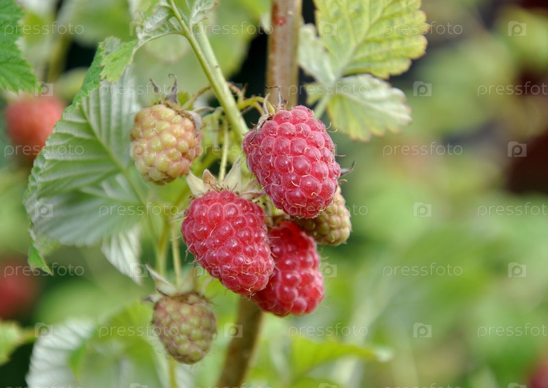Красные ягоды малины на ветке