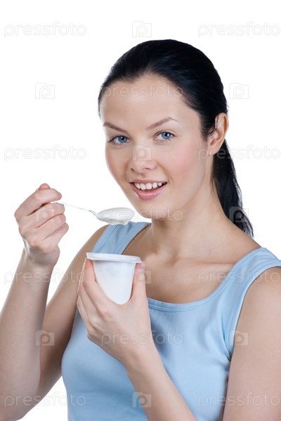 Молодая красивая женщина ест йогурт на завтрак или полдник. Изолировано на белом фоне