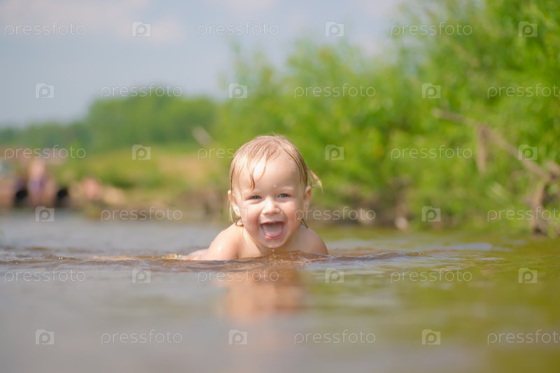 Маленькая девочка плавает в речке