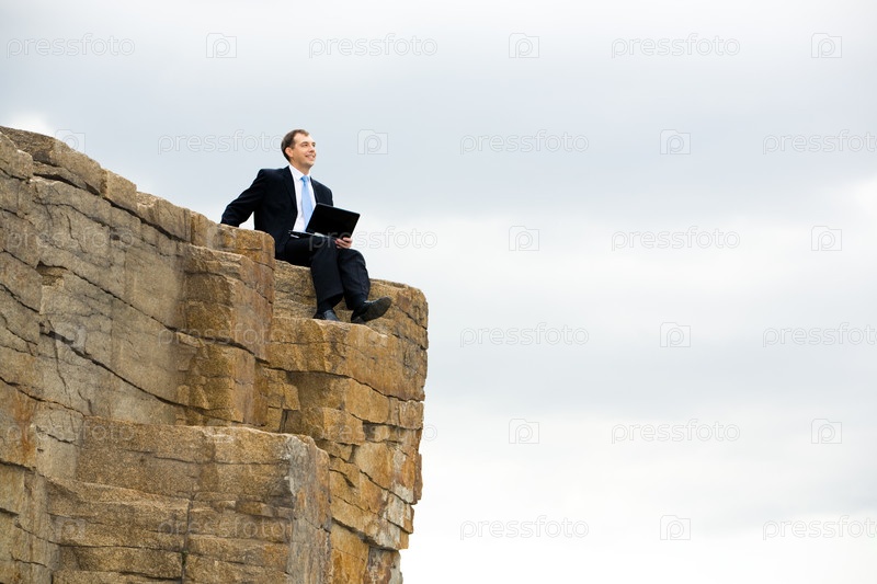 Изображение бизнесмена, сидящего на каменистых скалах с ноутбуком на коленях