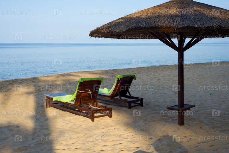 Зонт и два шезлонга на пляже