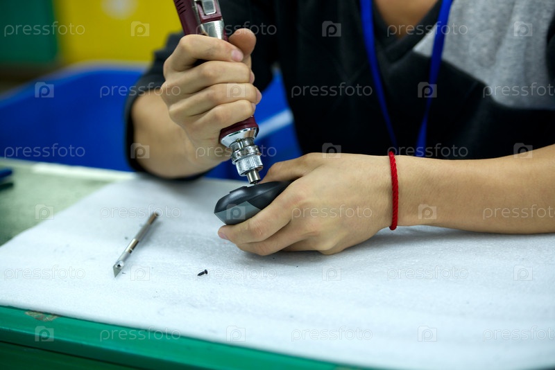 Работник с отверткой и компьютерной мышью на сборочной линии в Китае