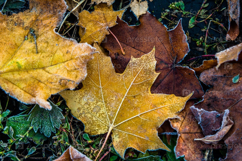 Красочные осенние листья и растения, покрытые инеем