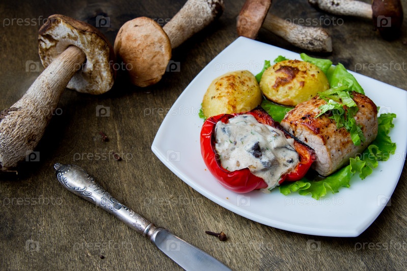 Стейк из свинины с печеным картофелем и грибным соусом