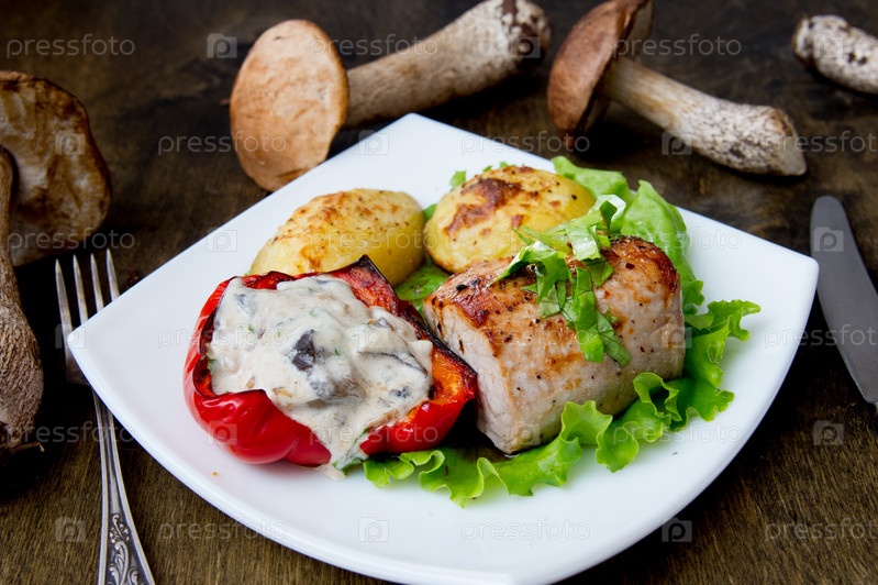 Стейк из свинины с печеным картофелем и грибным соусом