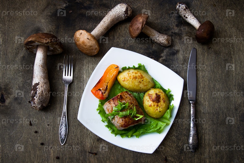 Стейк из свинины с печеным картофелем и грибным соусом