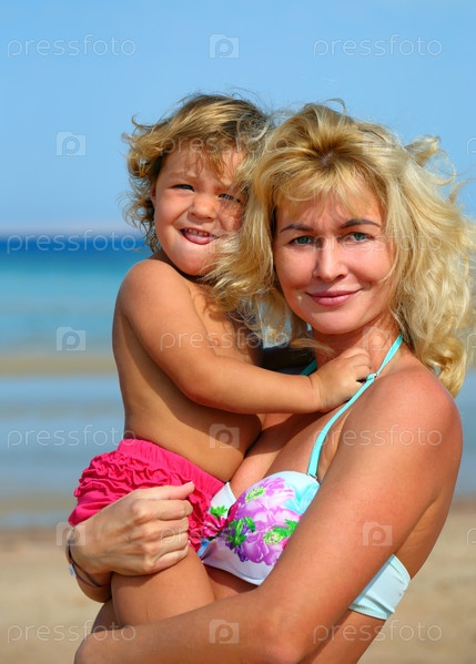 Счастливые мать и ребенок на пляже