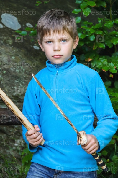 Серьезный мальчик с деревянным мечом