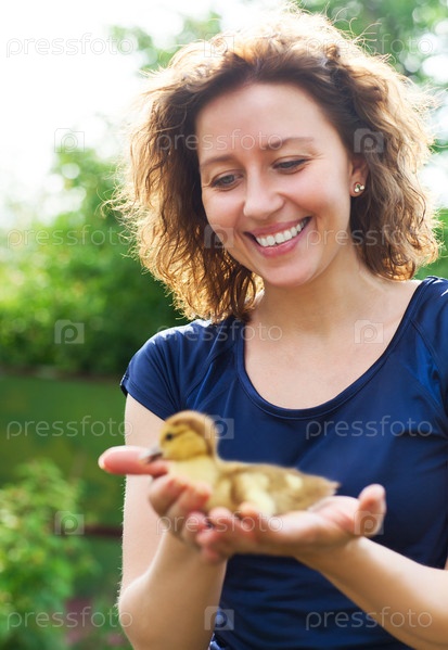 Женщина держит в руках маленького утенка