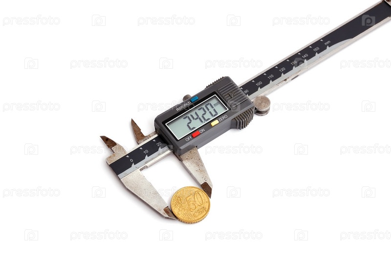 Измерение диаметра монеты с помощью электронного штангенциркуля. Белый фон