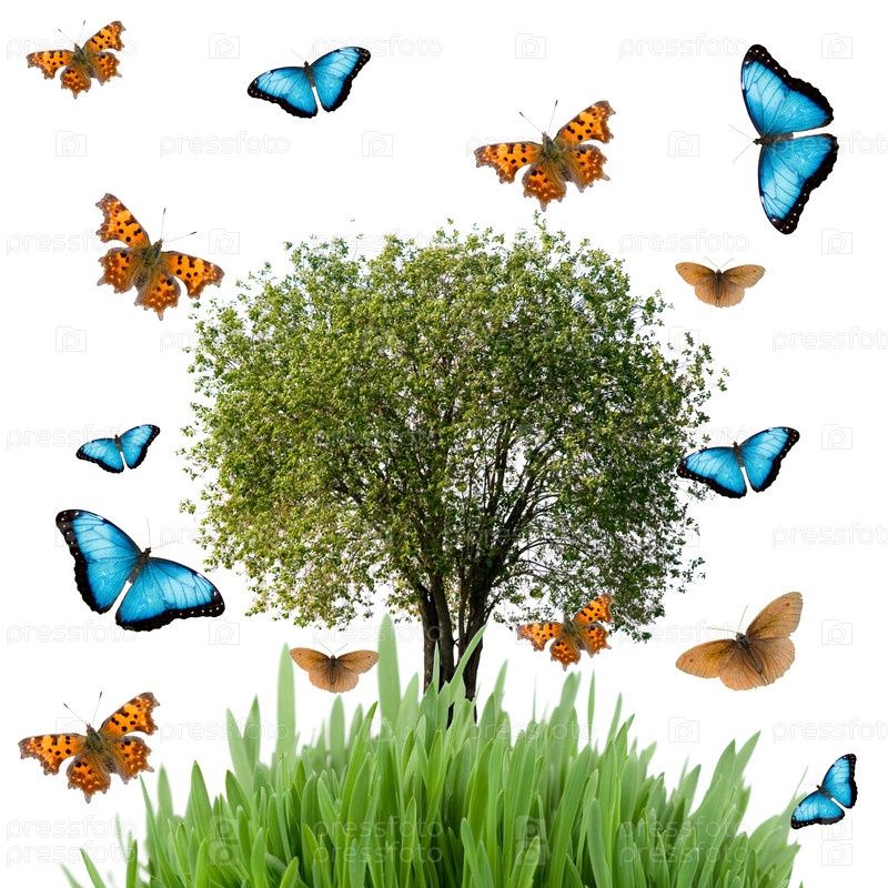 Дерево, трава и бабочками, изолированные на белом фоне