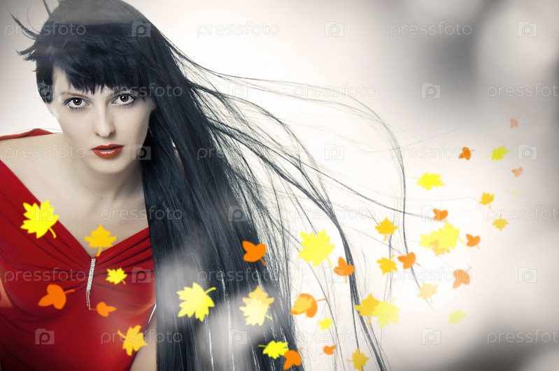 Красивая длинноволосая девушка и летящие осенние листья