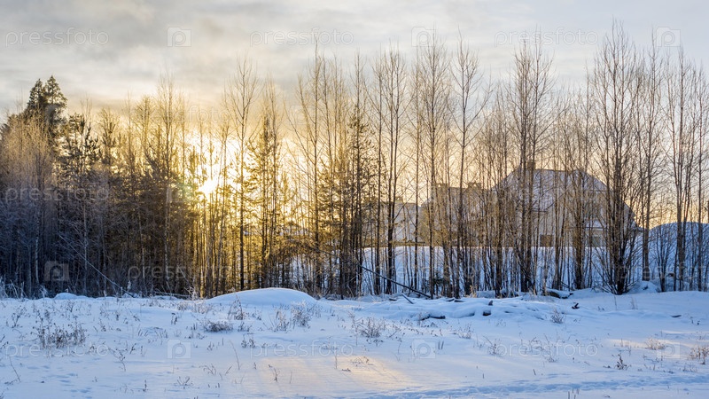 Домики зимой на закате в лесу