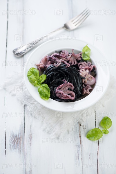 Черные тальятелле с осьминогами и базиликом